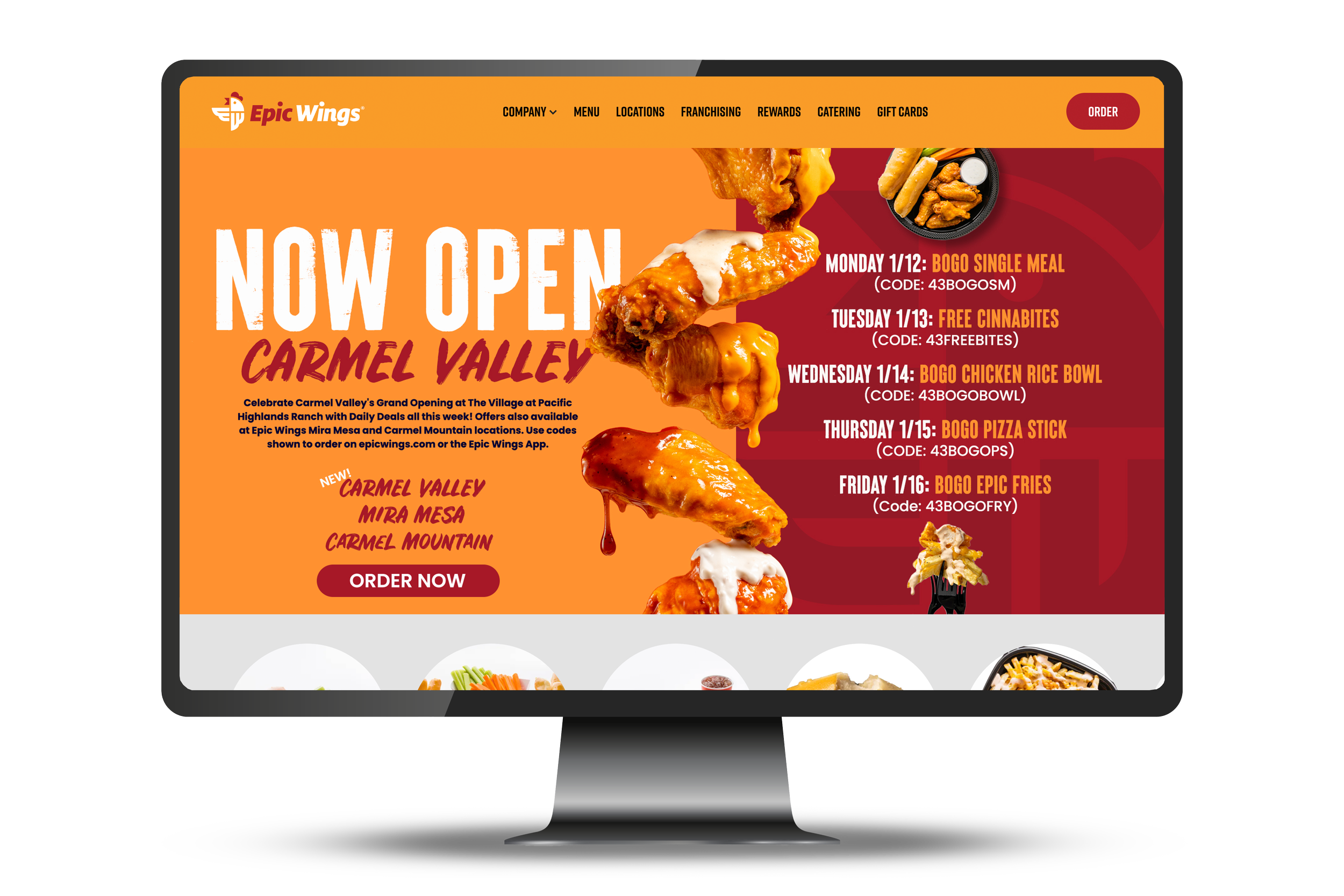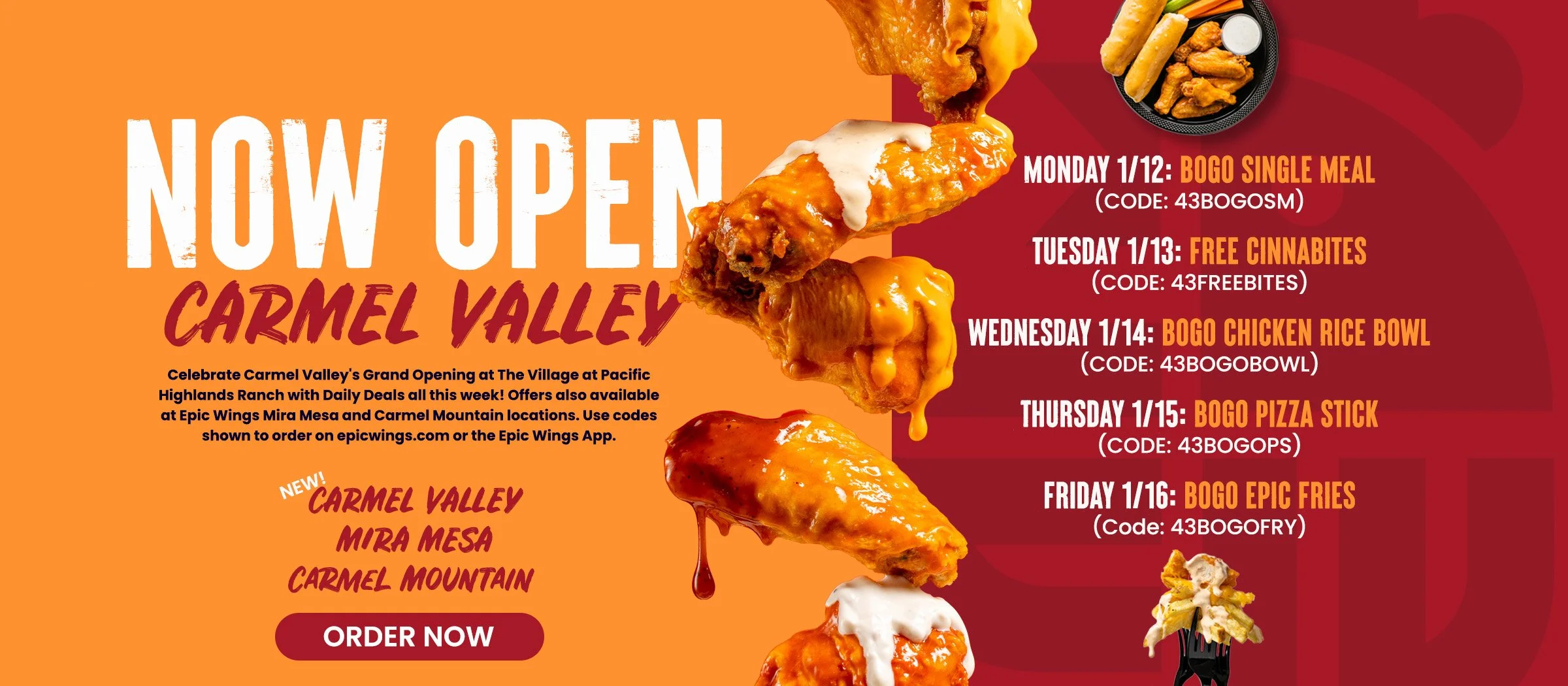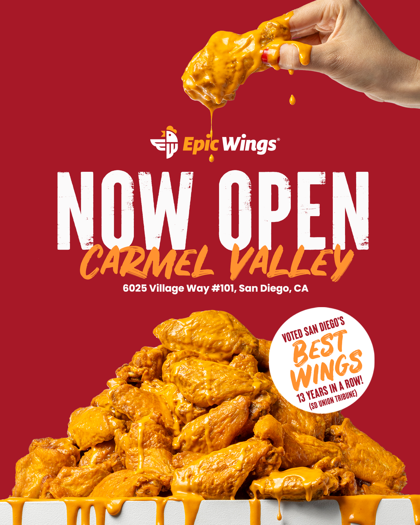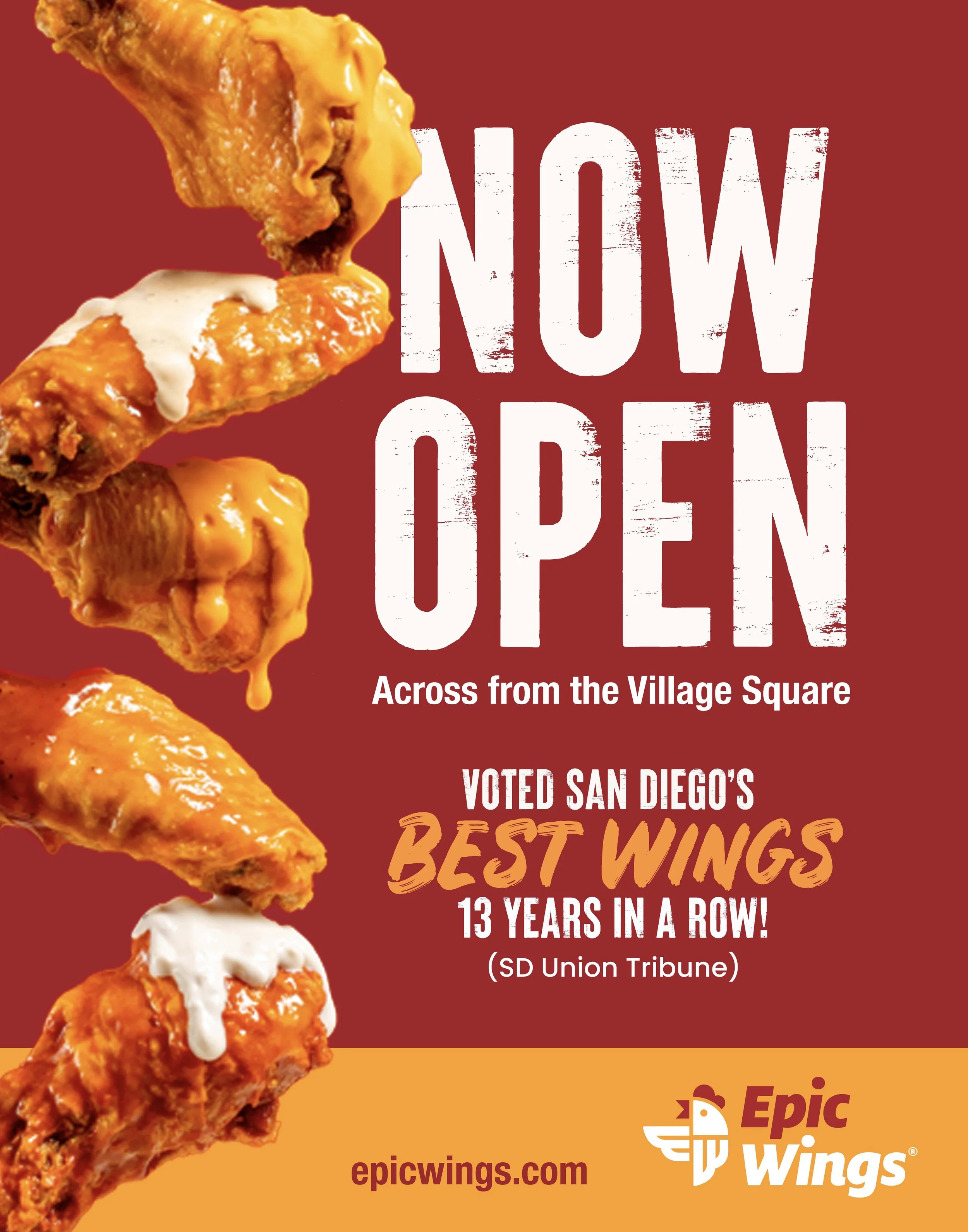New Opening campaign for Epic Wings in Carmel Valley, California. This included designing website homepage sliders, email, large-format print pieces, and social graphics.