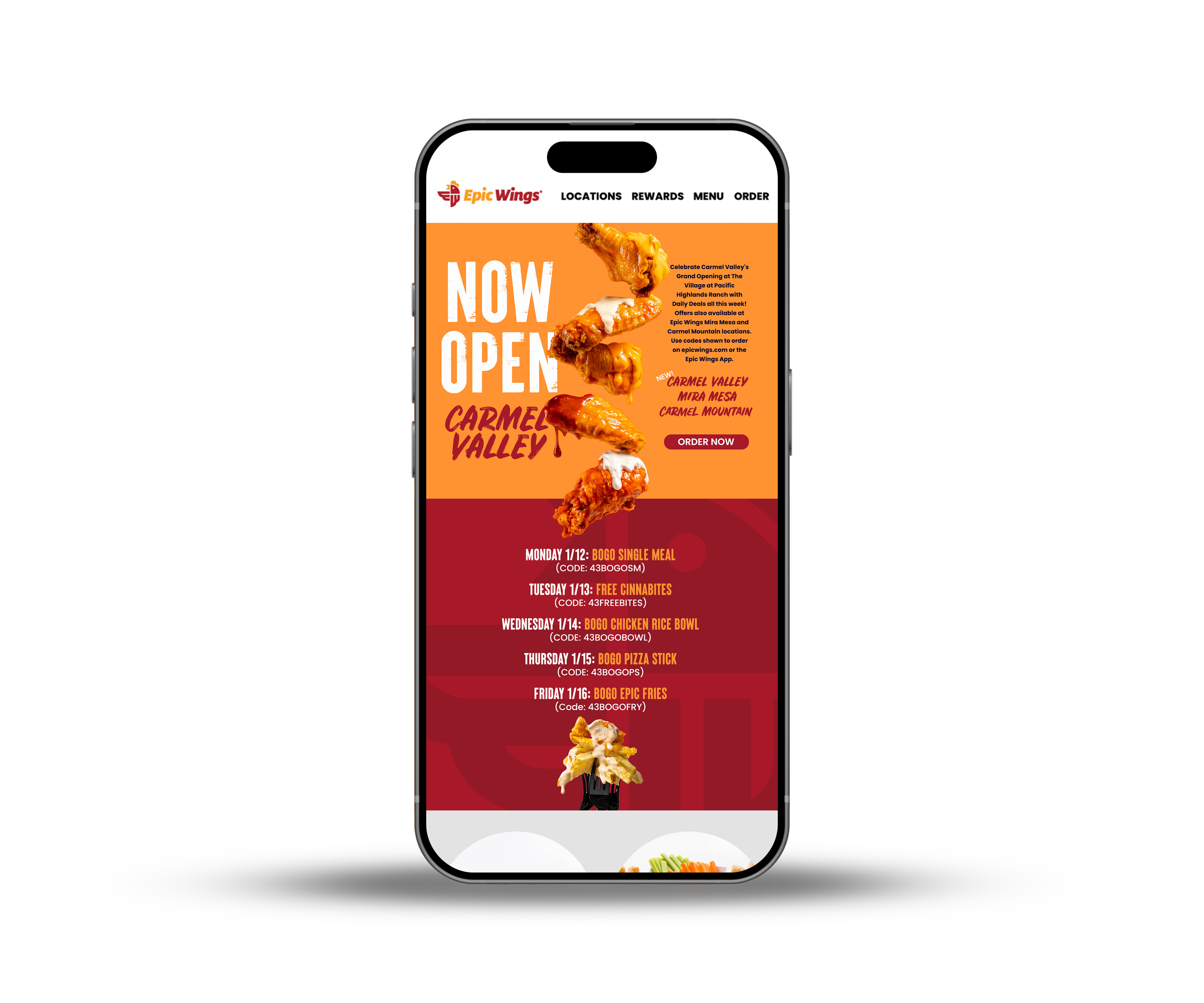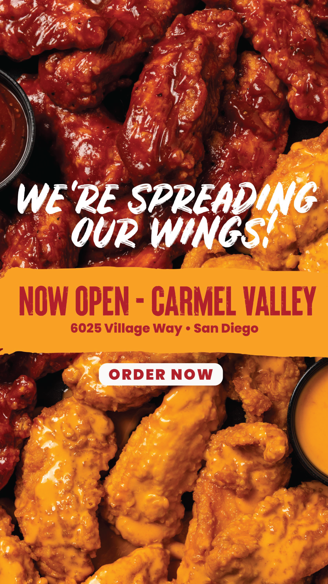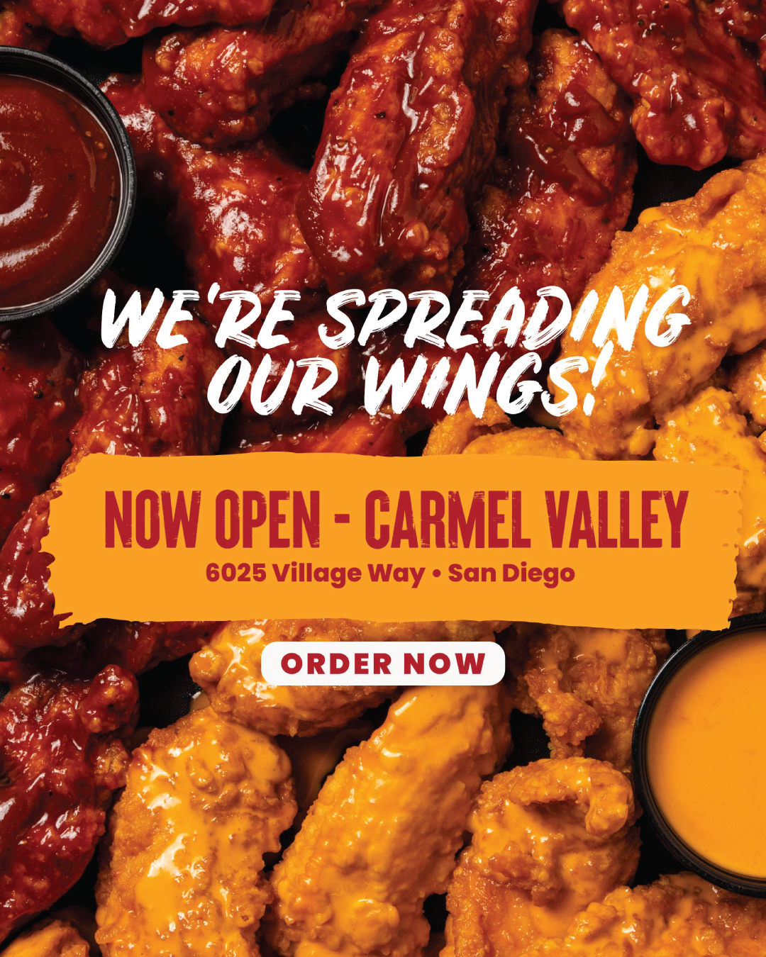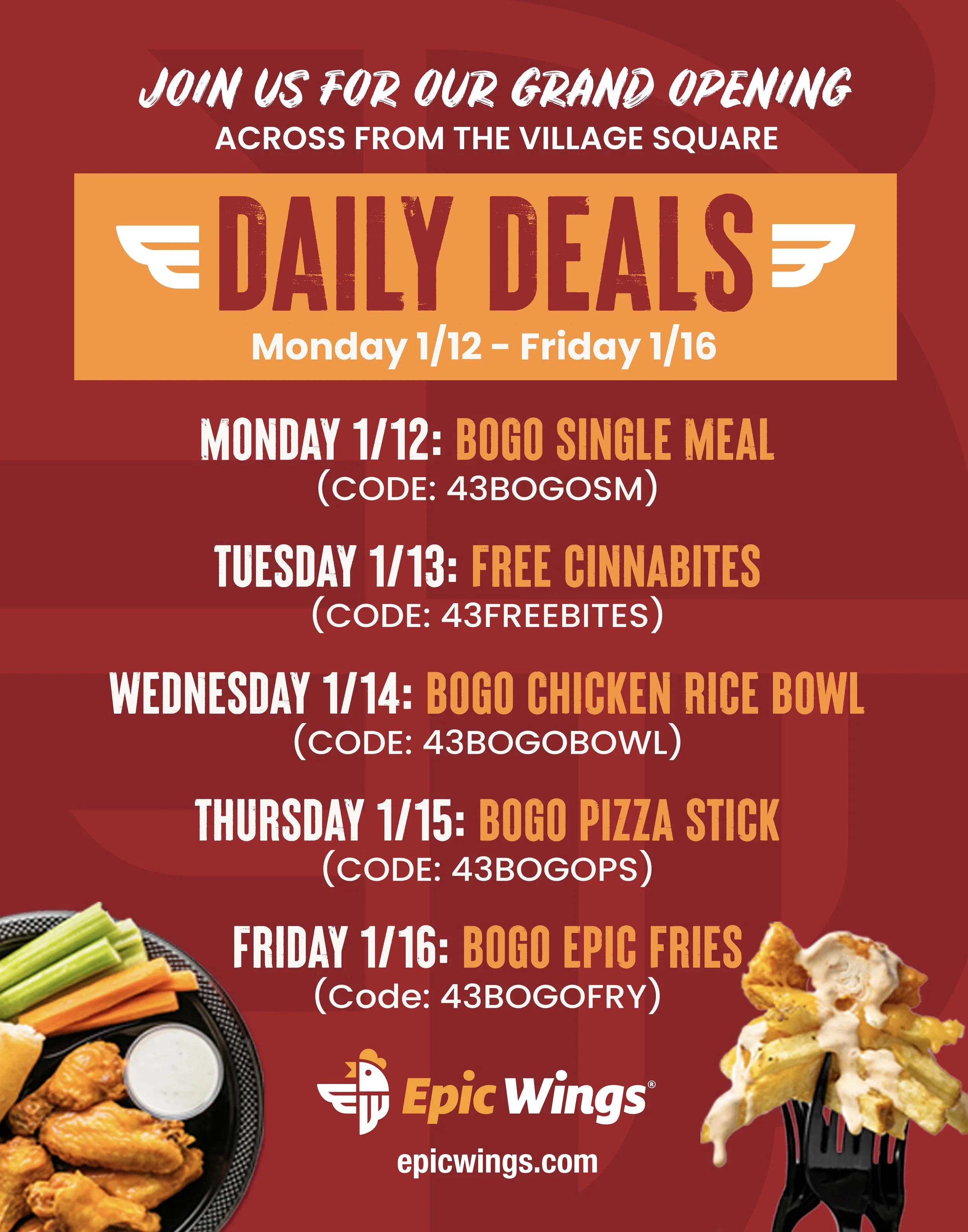 New Opening campaign for Epic Wings in Carmel Valley, California. This included designing website homepage sliders, email, large-format print pieces, and social graphics.